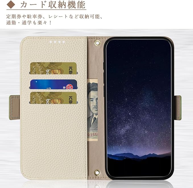 【カード収納】携帯ケース 手帳型は、内には3個の嵌め込みスロットと1個の自由なポケットがあって、カード、名刺、紙幣、定期券、運転免許証などを収納することができて、収納能力はとても強いです。この携帯ケースを使用して、外出はさらに財布を持つ必要がありませんでした、あなたの日常生活のために便利さをもたらします。