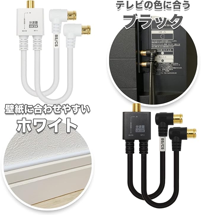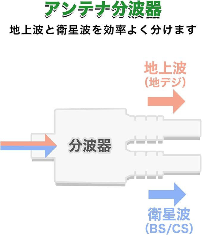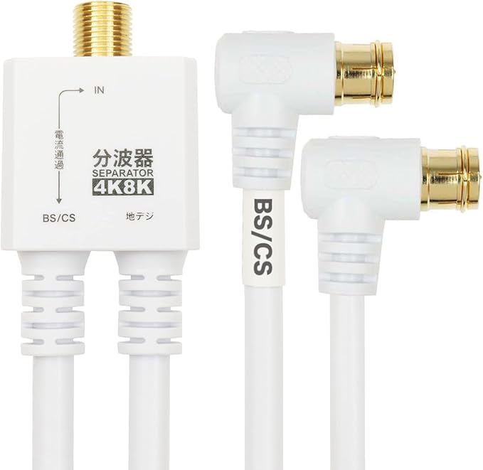 ■地デジ放送、BS/CS放送をそれぞれ視聴したいときはコレ! 地上波(UHF)と衛星波(BS/110度CS)を効率よく分け、1台のテレビで地デジ、BS、110度CS放送を視聴できます。 ■新4K8K衛星放送対応 従来の地デジ、BS、110度CS放送に加えて、最新の4K/8K放送にも対応しています。 ■ケーブル一体型構造 分波器本体と出力側ケーブルが一体型のつくりになっているため、分離型に比べて接続損失を軽減することが可能です。 ■便利なL字差込式コネクタ 狭い隙間での接続にはもちろん、テレビのアンテナ端子位置によっては、配線の露出を防ぐことができ非常に便利です。 ■BSアンテナ電源供給可能 【使用上の注意】 ご使用には入力用のアンテナケーブル(別売)が必要です。