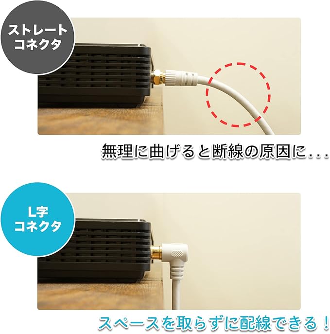 ●コネクタ規格:F型 ●コネクタ形状:L字差込式(金メッキ仕様) ●コネクタサイズ:W約14.8 x H約14.4 x D約30.2 mm ●インピーダンス:75Ω