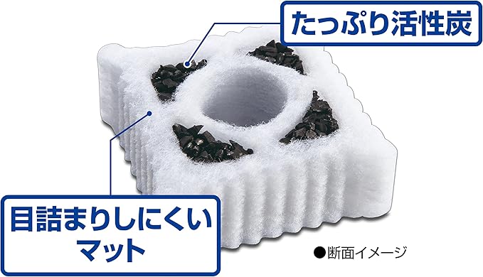 汚れを逃さずキャッチ。 白ニゴリ・悪臭も吸着する活性炭をたっぷり配合。 目詰まりしにくいマットの中に活性炭を配合したロカボーイ専用交換ろ過材のお徳用3個パック。