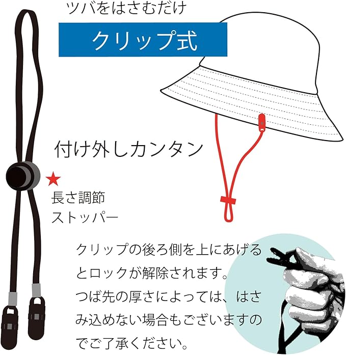 セット内のあご紐は、シンプルなものからよりセキュアなクリップ式まで、さまざまな帽子・用途に応じて選べます。自転車やハイキング、釣りなどのアウトドアシーンでの使用はもちろん、日常生活での突然の風による帽子の飛び防止にも役立ちます。また、子供から大人まで、家族全員で共有できる汎用性の高さも魅力の一つです。