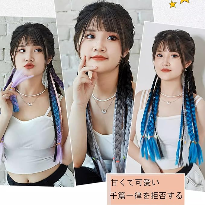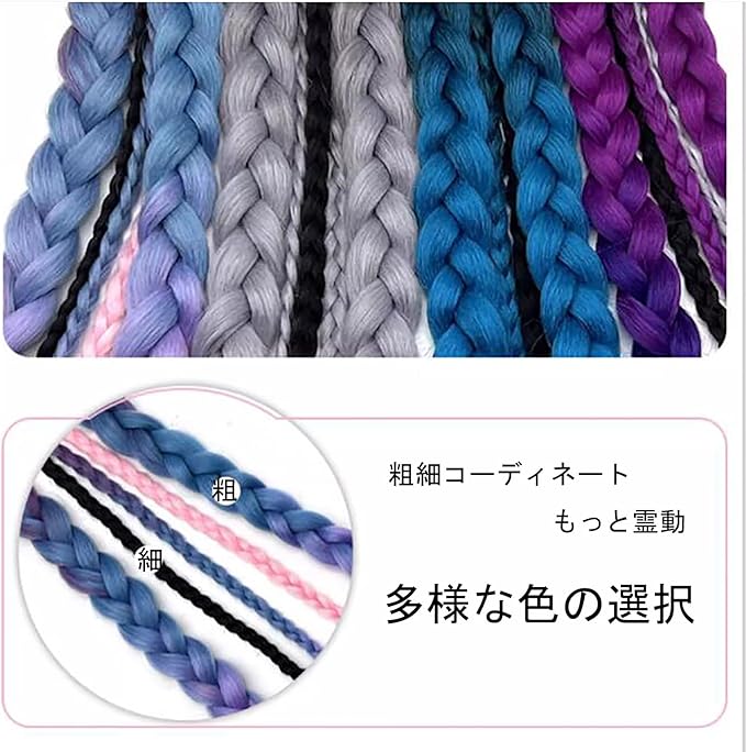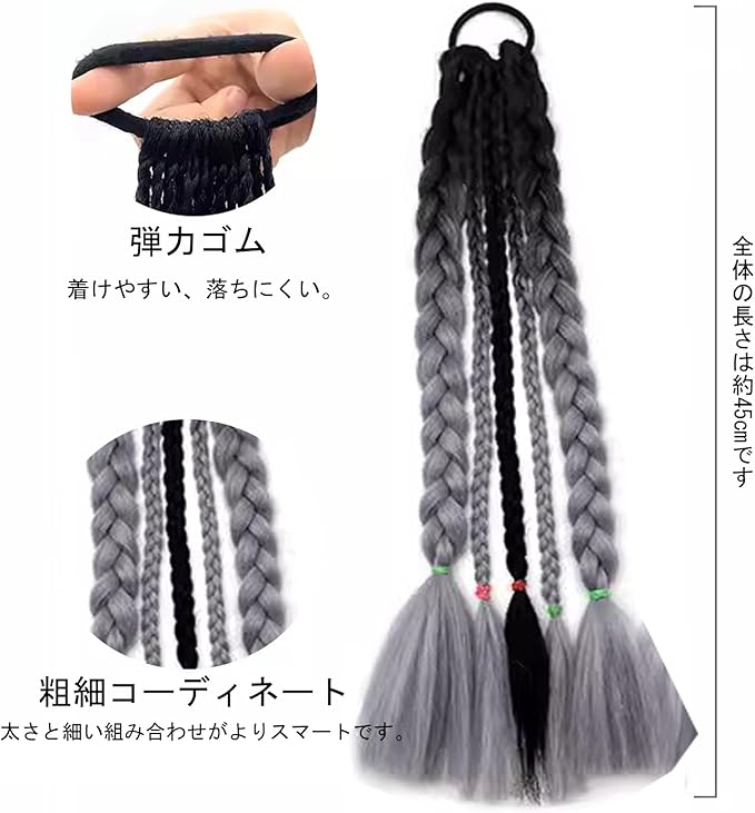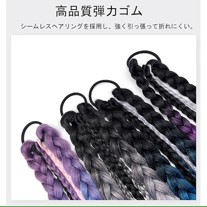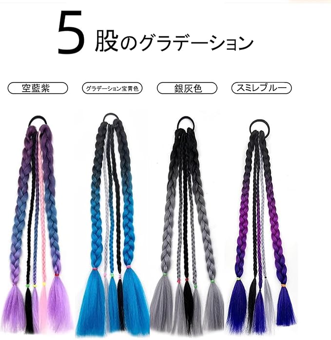 仕様:①長さ:50 cm。グラディエントバイオレット、ブラウンブラックスモッグブルー、ブラウンブラックサクラパウダー、グラディエントブルー、ブラウンブラック茶灰、グラディエント天籠紫、グラディエントシルバーグレー、7色。7種類のヘアカラーがデイリーコーデにぴったり。 材質:高級耐熱繊維。パーマをかけて染めてはいけない。ポニーテール部に取り付けられた編みウィッグは、ショートヘアでもロングヘアでも、さまざまなスタイルに合わせることができます。 クリップ:ゴムリング付きで髪に取り付けやすく、簡単にイメージチェンジ!このかつらかつらの3本編みは取り付けやすく、余分な助力や道具がなくても数分使えます。安定感抜群で一日中装着できます! ポニーテールやツールテールに直接取り付けることができ、使い方は非常に簡単で、数秒で散髪することができます。 様々な場面に適用され、子供や大人に適しています。撮影、ダンス、発表会、イベント、ロールプレイング、ハロウィン、ロールプレイング、パーティー、誕生日などさまざまな場面で使用できます