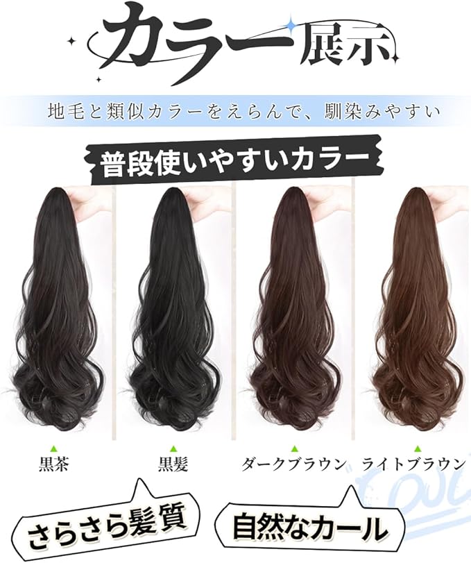 【商品情報】 長さ:約 50cm 重さ:約 120g カラー:軽やかな茶色のショコラブラウン、黒茶、ブラック、明るめのライトブラウン 素材:最高級耐熱ファイバー。コテ・アイロン・ドライヤー180度まで使用可能(130℃~160℃ぐらいがおすすめです)。マットなファイバーを使用し、よりテカリが抑えられた自然な髪質になりました。