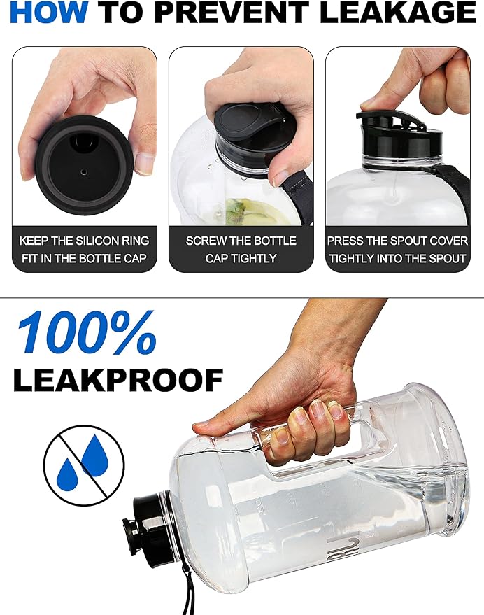【漏れ防止・飲みやすい】ハーフガロンのウォーターボトルの跳ね上げ式キャップも飲み口も密閉されています。 広い飲み口、または狭い飲み口という2通りの方法でスムーズに飲むことができます。 ジム用のバッグや衣類が濡れるといった心配がありません。