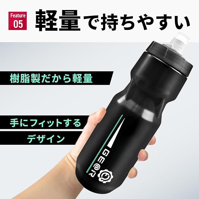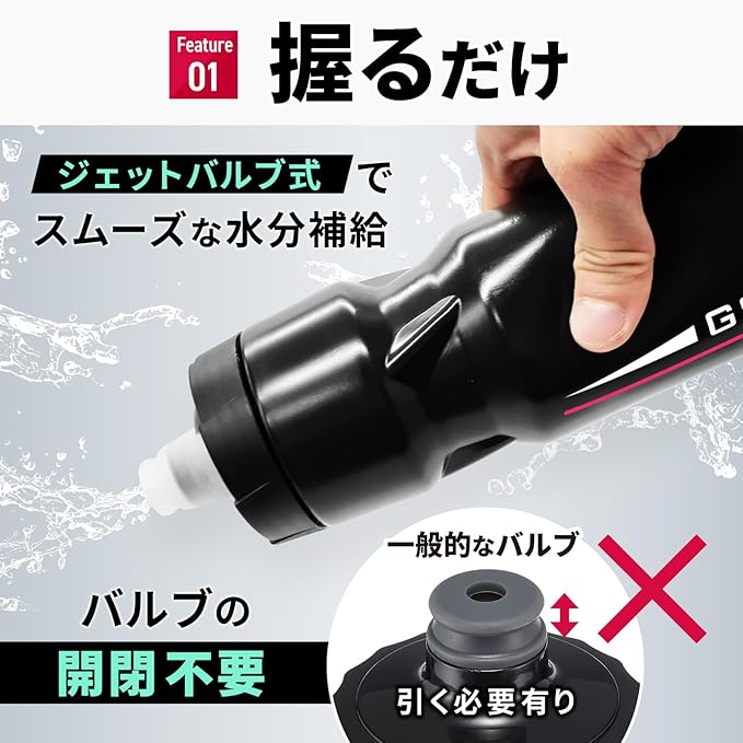 ✅【握るだけの簡単操作】このドリンクボトルは握るだけで簡単に水が出るジェットバルブ式です。ロックを解除しておけば、走行中でもスムーズに水分補給ができ、衛生的な設計となっています。柔らかい素材で作られているため、疲れていても楽に使えるスポーツボトルです。さらに、ボトルを逆さにしても漏れないため、安心して使えます。