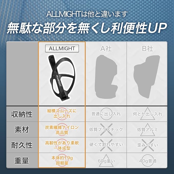 【サイクリングライフを快適に】ALLMIGHTのボトルケージを利用することで水分補給をスムーズに行えるため疲れにくくなり、自転車、ロードバイクでのロングライドや競技でのパフォーマンス向上に繋がることが期待できます。
