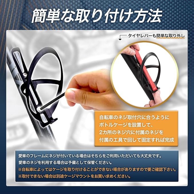 【ご購入前の注意点】※ボトルケージサイズとボトルサイズが合わない可能性がございますので要ご確認下さい。 ※自転車、ロードバイクによってはボトルケージを取り付けることができない場合がありますので要ご確認下さい。 ※取付できない場合は別途ボトルケージマウントをお買い求めください。