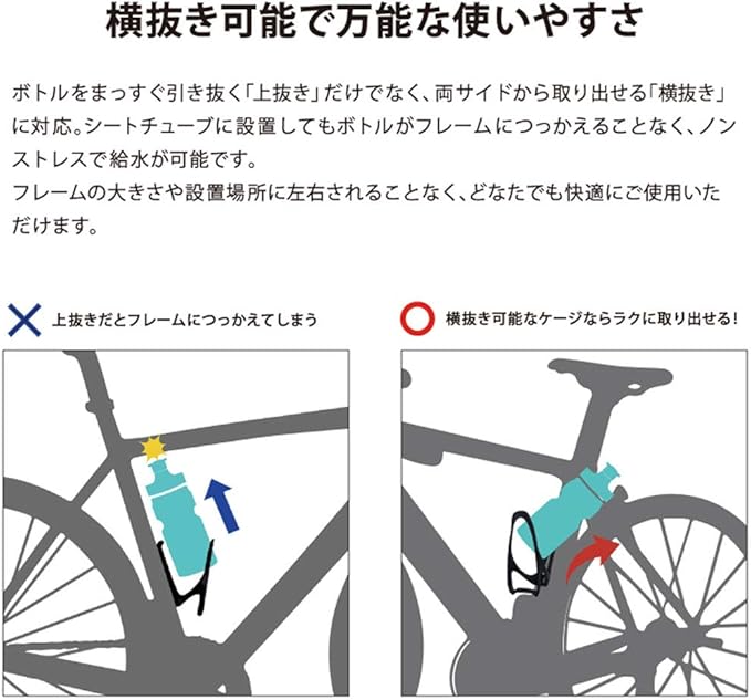 【使用状況を選ばない万能ボトルケージ】横出し可能で小さいフレームの自転車でも出し入れカンタン。 フレームサイズや設置場所を気にせずお使いいただけます。 価格もお手頃で、女性やこれから自転車を始める方にもおすすめです。
