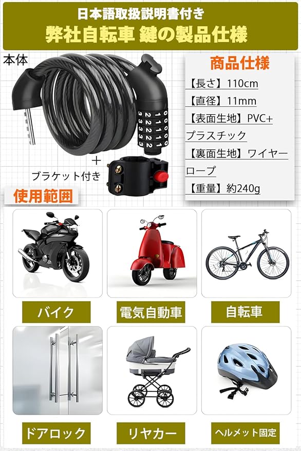 ✅【自転車固定式ロック製品仕様】5桁ダイヤル式のワイヤーロック。長さ:110cm 3cm ワイヤー直径:Φ11mm。重量:約240g。日本語取扱説明書、取り付け用ブラケット付属。