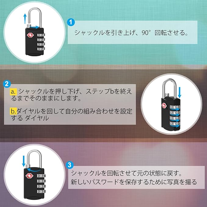 【4桁コンビネーションロック】 最新バージョンとセキュリティアップデート!4桁の数字は10,000通りの組み合わせが可能です。そのため、鍵のセキュリティを心配する必要はありません