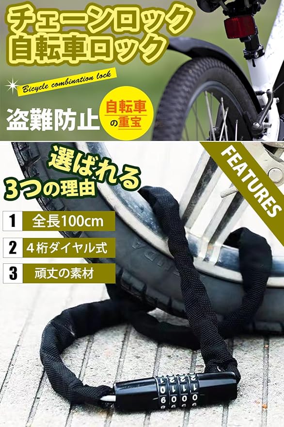 ✅【使いやすいチェーンロック】4桁ダイヤル式のチェーンロック。長さ:100cm 3cm。100cmと長めのロックですので、色々なパターンでご使用いただけます。使用しない時はコンパクトに纏められるので、車体に巻いたり、カバンに収納が可能です。