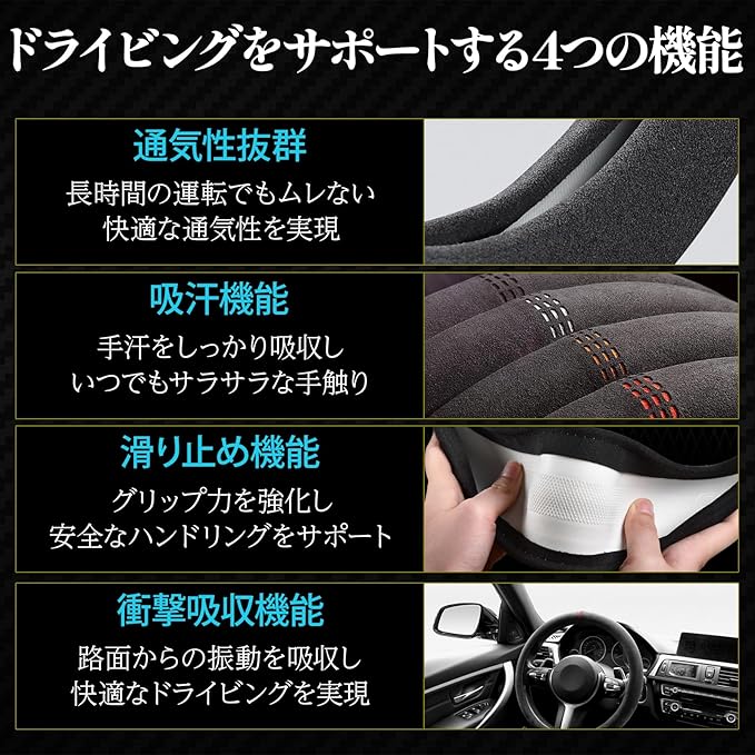 【滑り止め&衝撃吸収で快適ドライブ!】滑り止め加工でしっかりグリップし、衝撃吸収素材が振動を和らげ、運転中の疲労が軽減されるので、長時間のドライブも快適にすることができます。操作性と快適さを両立させたこのステアリングカバーを是非、お試しください。