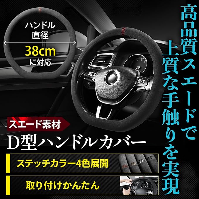 【高品質な質感!】しっとりと手に馴染む高品質なスエード素材のハンドルカバー(ステアリングカバー)です。車用でMサイズの38cmD型(D形)ステアリングにフィットするので、様々な普通車、軽自動車に取り付けることができます。取り付けも純正ハンドルに被せるだけなので簡単です。