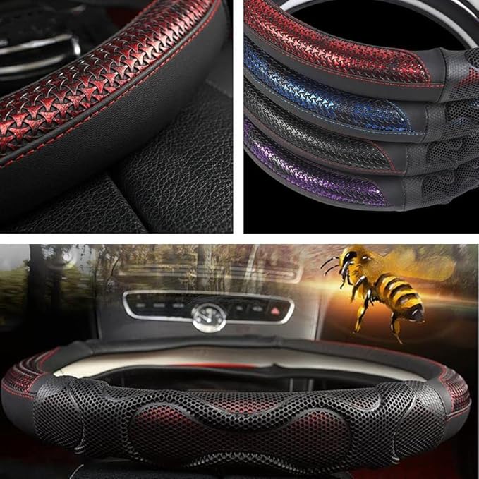 【手触り感にこだわった調】ハンドルカバーサイズ直径38CM,市販しているいつくかの本革または合皮のコンビネーションのハンドルカバーより質感高く見た目も愛車にマッチしています。デザイン性と耐久性に優れています。