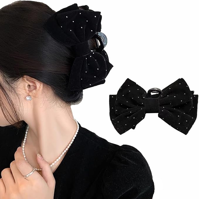 ヘア クリップ AUTAKI ヘアクリップ 大きめ リボン ベロアタイプ ラインストーン バンス リボン 可愛い 大人っぽい 、 しっかりとまる バンス 髪留め 華やか アクセサリー 髪留め 韓国風 上品 まとめ髪 シンプル 贈り物 レディース用 おしゃれ (ブラック)