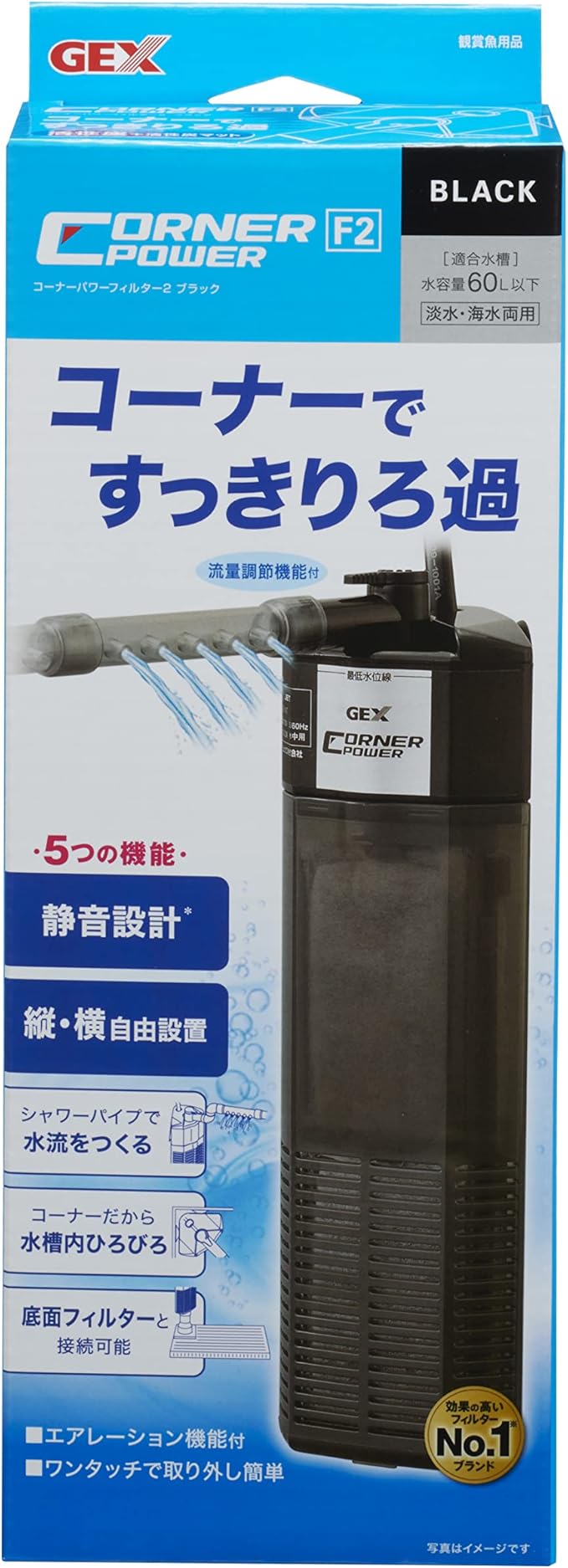 【5つの機能】1.静音設計 水中モーターで動作音が静か。※当社エアーリフト式フィルターとの比較。2.縦・横自由設置 水槽のレイアウトや魚種に合わせて設置方法が選べる。横置きにすれば水深の浅いカメ水槽にもぴったり。3.シャワーパイプで水流をつくる シャワーパイプを使用して溶存酸素量UP。ゆるやかな水流をつくる。4.コーナーだから水槽内ひろびろ コーナーにぴったりフィットするので、水槽内をひろびろ使える。魚が隙間に入らず安心。ワンタッチで取り外し簡単。5.底面フィルターと接続可能 付属のパーツを使用してGEX「マルチベースフィルター」と接続しろ過能力を更にアップ。