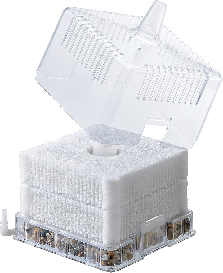大型サイズでパワフルろ過!汚れを取り除き、輝く自然の水づくり! 活性炭入り特殊ろ過材が白ニゴリ悪臭の元を吸着! ろ過材交換も簡単 マットで水中のゴミを取り除く『物理ろ過』、バクテリアが餌の食べ残しやフンを分解する『生物ろ過』、活性炭が黄ばみや悪臭を吸着する『吸着ろ過』のトリプルろ過システムを採用。 ダブル活性炭マット採用!1個づつマット交換ができるので急激な水質変化を避けられる。 底部にたまったフンやゴミをしっかり吸引! いつも新鮮な酸素を供給、細かな泡で酸素たっぷり! 水槽のコーナーに置ける構造なので水槽内がひろびろ使える。 カバー2か所のロック部を押して引き上げるだけなのでろ材の交換もラクラク! 酸素供給用として他フィルターの補助用としてもご使用いただけます。 ※ご使用には、エアーチューブ、エアーポンプを別途お買い求めいただく必要があります。 適合水槽:水容量約88L以下の水槽 製品サイズ:幅12.0 奥行12.0 高さ12.0cm(本体部のみ)