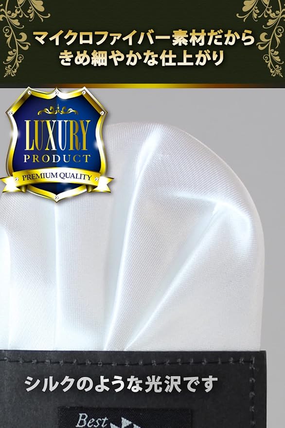 イタリアやイギリスにおいてスーツやネクタイと合わせて楽しまれるようになったメンズチーフ。 シルク、麻、リネン素材の限定商品に負け劣りしない、光沢を持ったポリエステル素材で仕上げました。