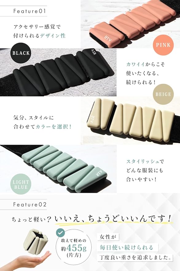 ✅【商品コンセプト】女性目線でカワイイデザインのリストウェイト・アンクルウェイトを皆様に届けたい。引き締まった体を手に入れたいけれど、運動は苦手、なかなかやる気にならない、そんな方々の背中を少しでも押すことが出来ればという2つの思いから、AIRが生まれました。