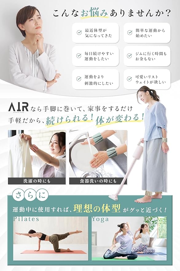 ✅【家事トレ革命】ジムでハードに鍛えることが全てではありません。自分が出来ることから始めたら大丈夫なんです。AIRは普段の家事に+αするだけ。水にも強くあらゆる家事をしながらご使用可能です。新感覚ながら運動で理想のカラダを手に入れる第一歩を踏み出しましょう。