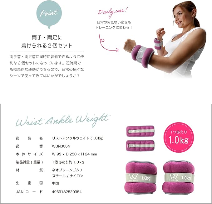 【装着するだけで普段の運動がパワーアップ】ウォーキングやエクササイズ時に装着するだけで負荷をプラスできるリスト・アンクルウェイトです。トレーニングとして使用する以外にもダイエットやリハビリなどにもおすすめです。時間を作って運動が出来ない方も、買い物や掃除などの家事の際に巻くだけで運動負荷がアップします。