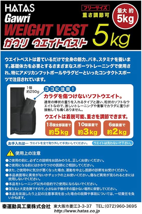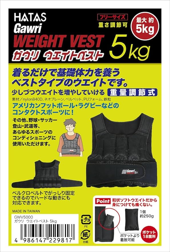 着るだけで基礎体力を養うベストタイプのウエイトです。体力にあわせて重さを変えることができる重量調節式。最大5kg。1個約250gのウエイトを18ヶ所のポケットで着脱可能! 粒状のソフトなウエイトなので、激しいトレーニングや衝撃でカラダに重りが接触しても痛くありません。 アメリカンフットボール・ラグビーなどのコンタクトスポーツに! その他、野球・サッカー、登山・武道等、あらゆるスポーツのコンディショニングに使用いただけます。2重のベルクロベルトでがっしり固定できるのでハードな動きにも対応できます。
