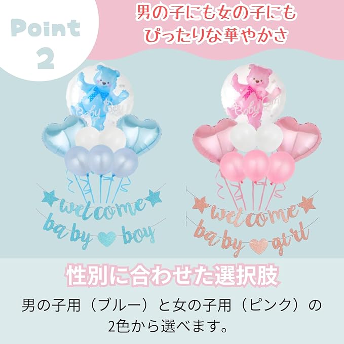 【性別に合わせた選択肢】男の子用(ブルー)と女の子用(ピンク)の2色から選べます。ベビーシャワーや関連イベントの装飾が簡単に行え、参加者に楽しい雰囲気を提供できます。