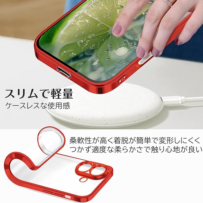 iPhone 16 用ケース クリア tpu シリコン メッキ加工 スリム 極薄軽量 透明 スマホケース 耐衝撃 QIワイヤレス充電対応 ストラップホール 黄変防止 一体型 人気 アイフォン16 用携帯カバー レッド