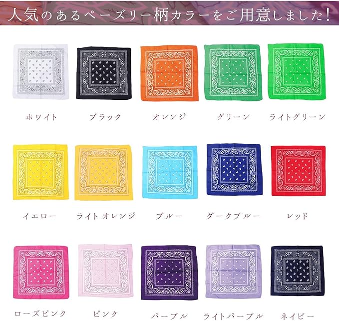 ①[定番のペーズリー柄バンダナレディース、メンズ15枚セット] お洒落アイテムには欠かせないペーズリー柄バンダナセットです。カラフルな全15色を集めてお届け致します。