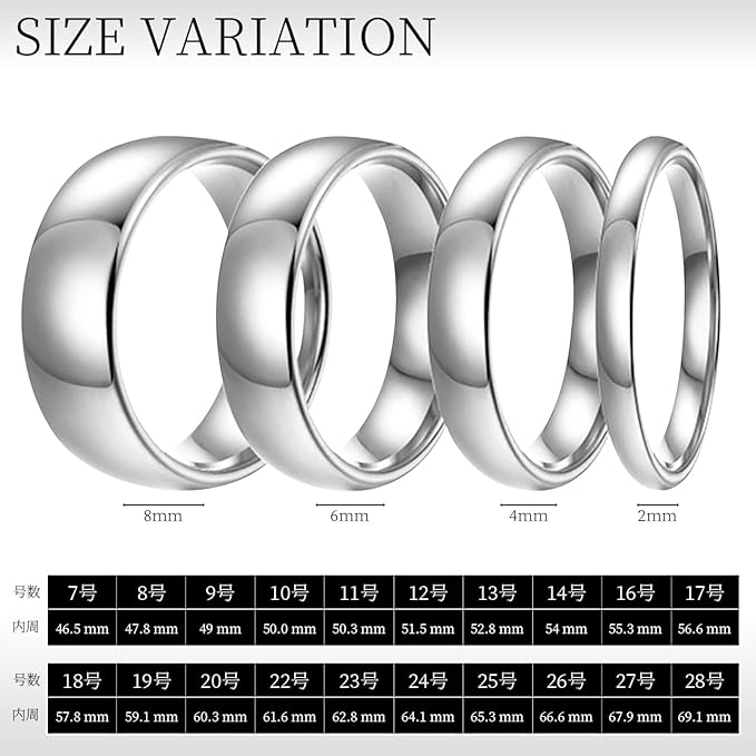 【バリエーション】サイズは7号~28号、カラーは4色、指輪幅も4タイプと幅広く揃えております。画像内にもサイズの参考が載っておりますので、お客様の指のサイズを計測された上で、サイズをお選びください。カラーも4種類からお選び頂けます。