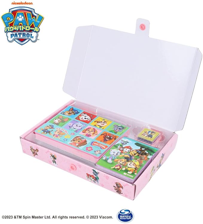 パウ・パトロール柄のスタンプセット。すぐに押して遊べるメモ帳つき。