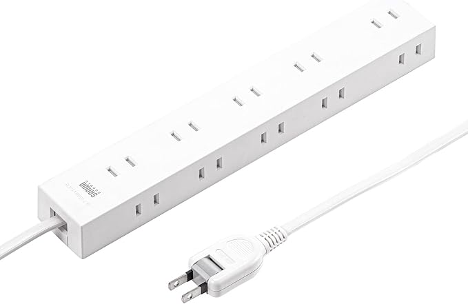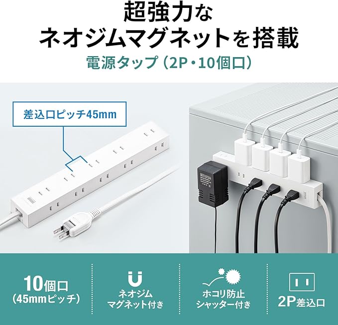 サンワサプライ(Sanwa Supply) 電源タップ 10個口・2P (1m) たくさん挿せるレイアウト 強力ネオジムマグネット ほこりシャッター スイングプラグ ホワイト TAP-2210-1W