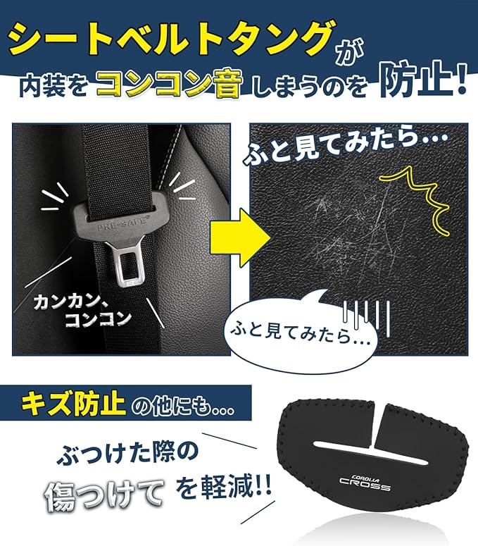 特に、乗降時にシートベルトバックルが車体や内装にぶつかって発生する傷や音を軽減し、車内の美観と静音性を保つのに役立ちます。快適かつ安全なカーライフをサポートします。また、車内を引き立てるドレスアップパーツとしても人気が高く、大切なお車に上質なアクセントを加えます。