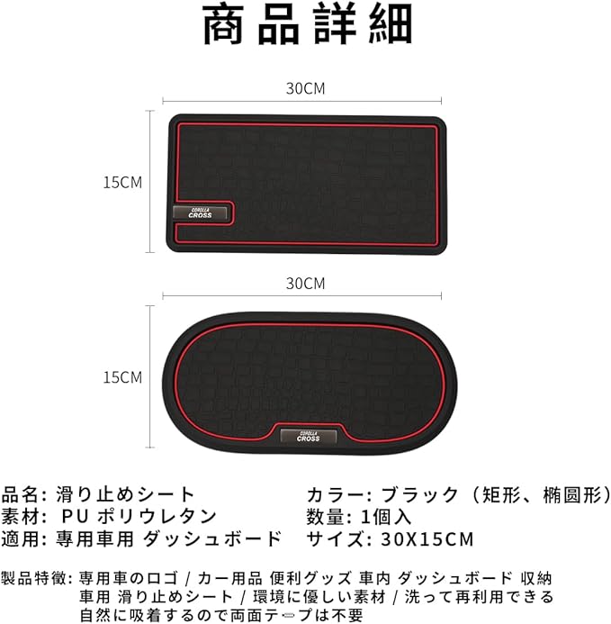 【セット内容】ノンスリップマット 1個、ブラック、30x15cm、専用車ロゴ付き、長方形と楕円形の 2 つの異なる形状をご用意しています。