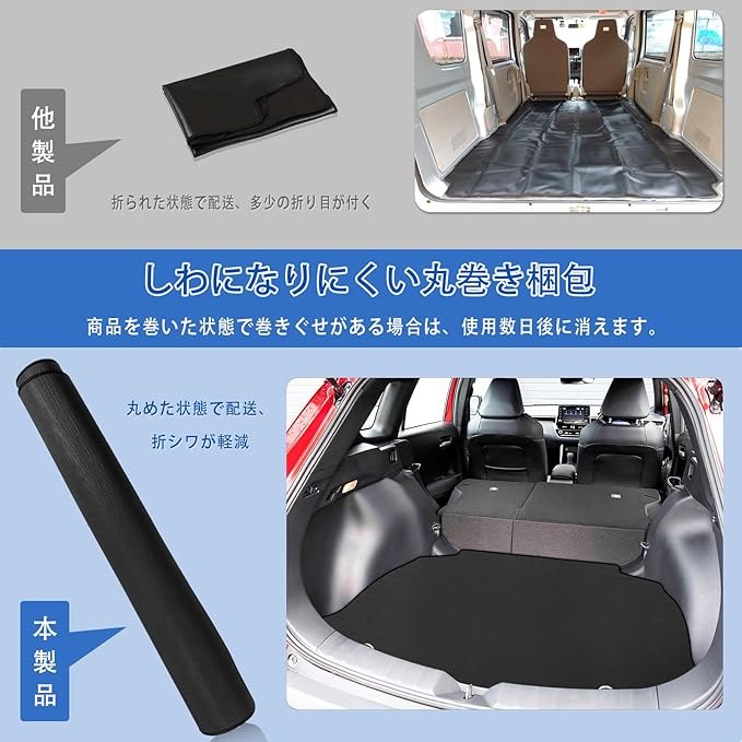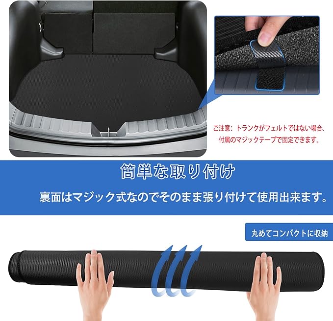【巻ける収納&簡単な取り付け】:ラゲッジマットは、巻いて収納できるので、使用しないときはコンパクトにまとめてスペースを取らずに収納できます。使いたい時には、簡単に広げて取り付けるだけでOKです。初心者でも簡単に装着できます。トランクがフェルトでない場合、付属のマジックテープを利用して固定できます。