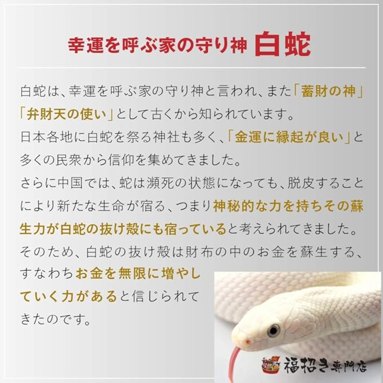 中国では蛇のことを小龍と言い、お金を運ぶものとしてあつかわれております。 蛇は古来からめでたいものであるとし、長寿・生殖・財運 ・権利のシンボルでもあります。 また蛇の中でも白蛇は最高の霊力を持つと言われ、脱皮ごとに再生することにより生命の源・出世・金運・財運をもたらし、白蛇は蓄財の神でもある、弁財天の眷属と言われています。 そんな縁起の良い白蛇の抜け殻です。