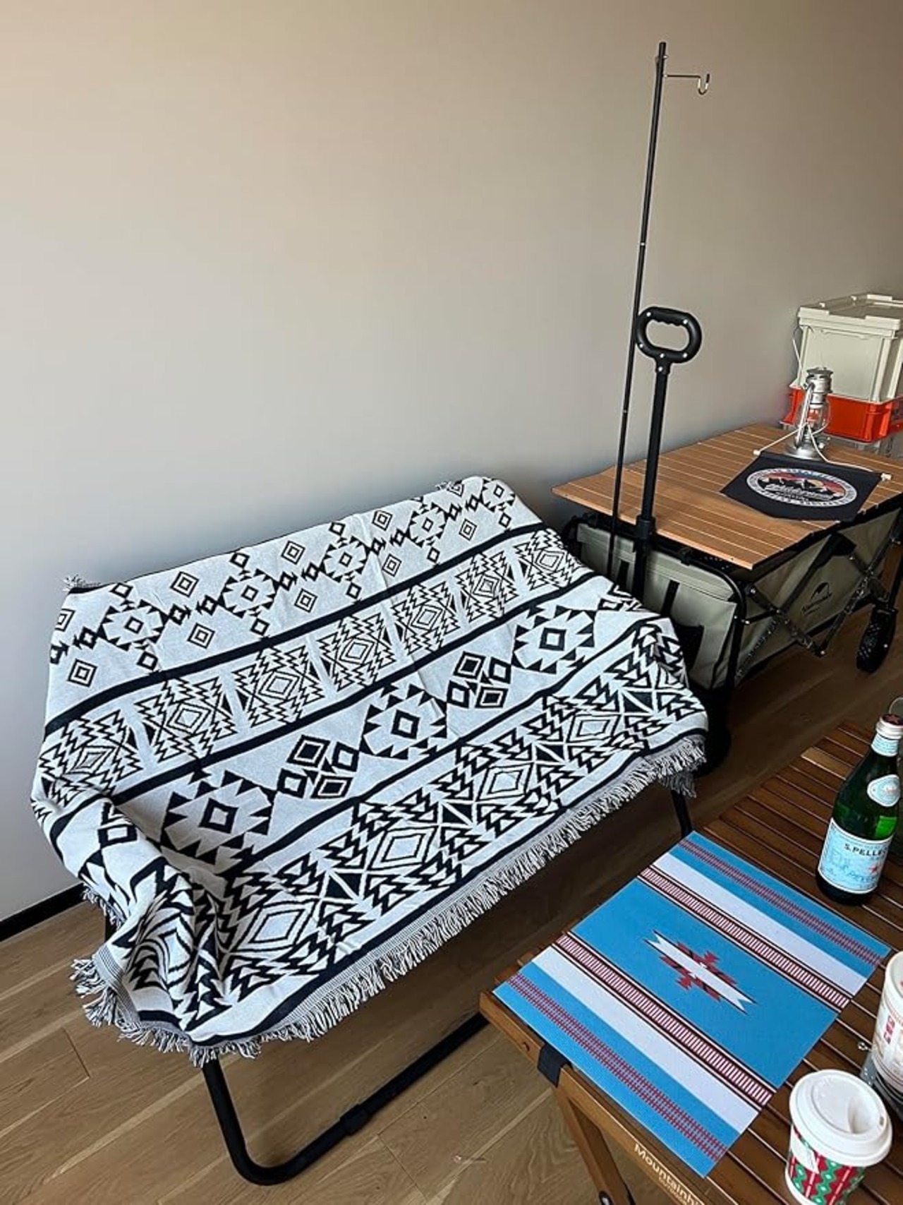 大判のメキシカンラグをコットの上に敷くだけで、まるで先住民が生活しているような空間に。ナチュラルな色あいのテントやテーブルに、メキシカンラグの派手めなデザインがマッチしています。
