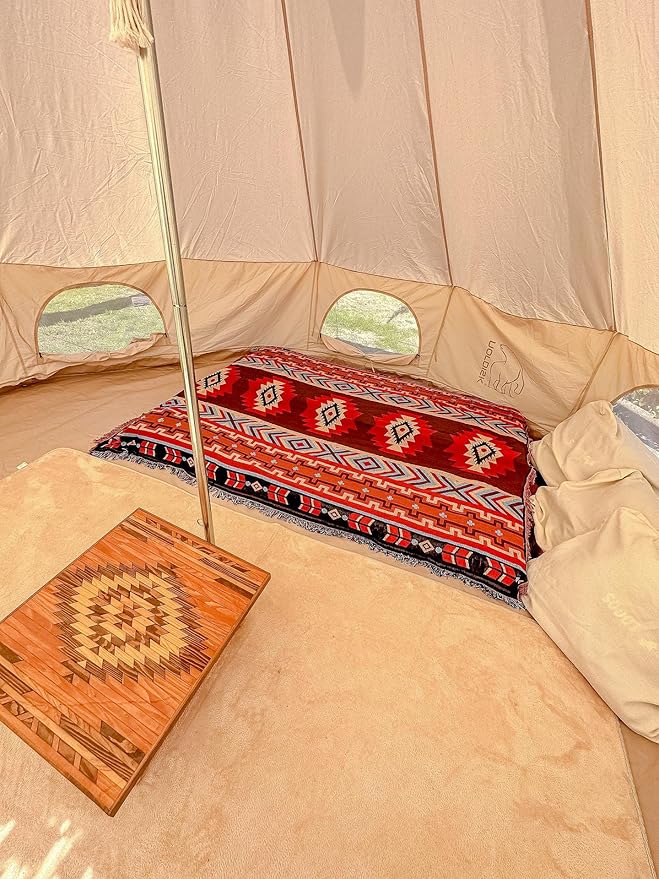 大判のメキシカンラグをコットの上に敷くだけで、まるで先住民が生活しているような空間に。ナチュラルな色あいのテントやテーブルに、メキシカンラグの派手めなデザインがマッチしています。