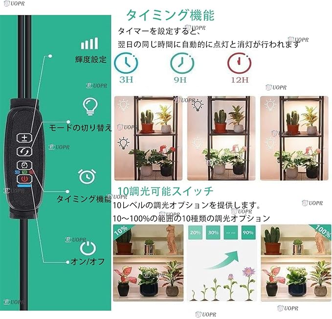 【調整可能な明るさ】この成長光には調整可能な明るさがあり、10レベルから100%の10レベルの調光オプションを提供します。さまざまな植物の照明要件を満たすために、植物が成長する理想的な照明環境の明るさを簡単に調整することができます。