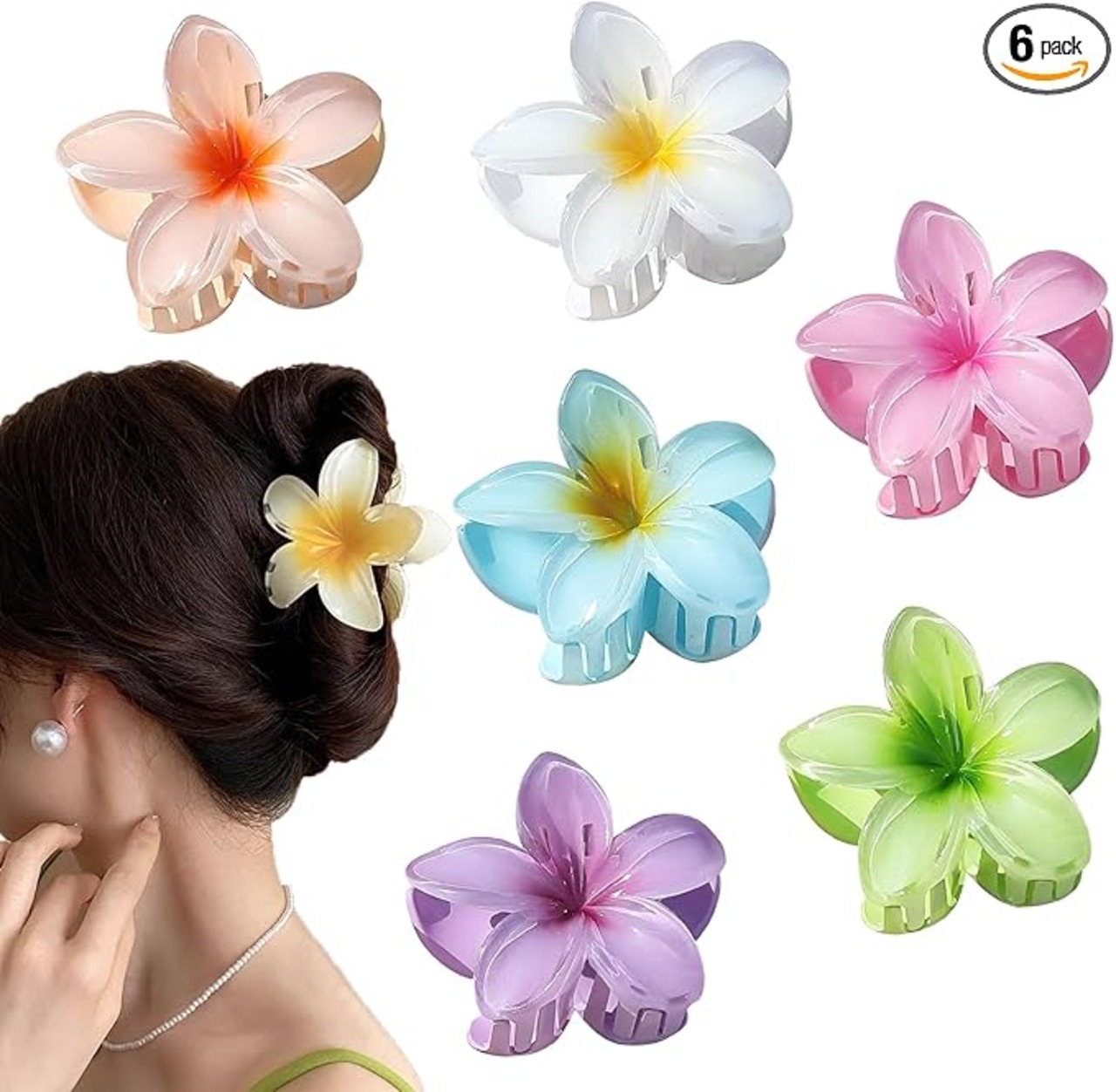 【ハワイアンリゾートスタイル】8cmの使いやすいサイズで、クラシックなプルメリア(ハワイの花)デザインを再現。アクリル製の立体花びらが、着けるだけで南国のビーチ気分を演出。