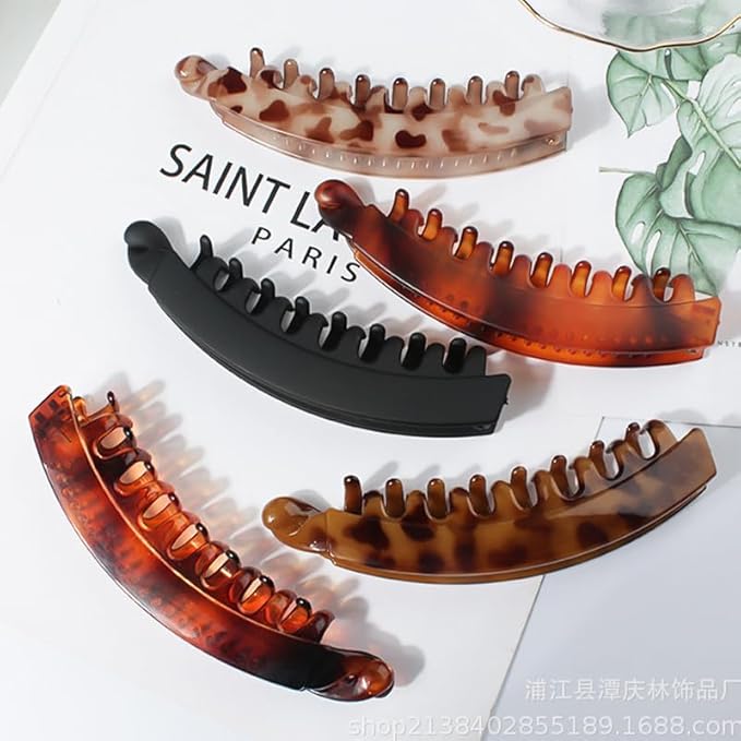 このバナナクリップは、動物柄やヒョウ柄のデザインが特徴的で、華やかな印象を与えます。軽量でありながら、縦型のカーブ形状が髪をしっかりとホールドします。大きめのサイズで使いやすく、光沢のある仕上げがスタイリッシュなアクセントになります。