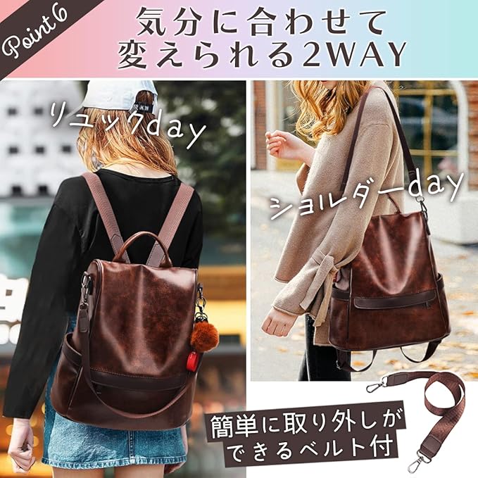 なめらかで高級感のあるPUの生地で年代やTPOを問わずに長くご使用いただけるデザインです。 リュックとしても、付属のショルダーベルトに付け替えてショルダーバッグとしても使える2WAY仕様になっています。