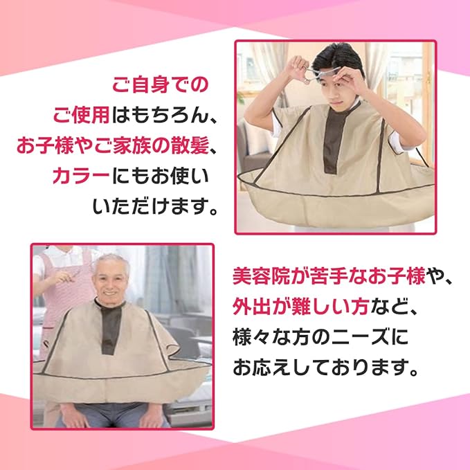 セルフカットをする際、切った髪が周りに飛んだり、服などに付いたりして大変な思いをしていた方にぴったりの商品です。 このケープを被るだけでご自宅でのセルフカットが楽になります。 切った髪は周りのマント部分に溜まっていくので、散髪後はそのまままとめて捨てるだけ! 首部分もすっぽり覆ってくれるので首回りに付く髪のチクチク感も軽減してくれます。 セルフカラーの際の毛染め液の飛び散り防止にも◎ ご自身でのご使用はもちろん、お子様やご家族の散髪、セルフカット、カラーにもお使いいただけます。 美容院は嫌がってしまうというお子様や、なかなか外出が出来ない、外に髪を切りに行くのは面倒、など 様々な方のニーズにお応えしております。