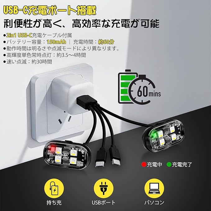 【USB-C充電ポート・省エネ設計】本ライトはUSBタイプC充電ポートを搭載し、内蔵バッテリーで繰り返し充電可能。頻繁な電池交換が不要で、省エネかつ環境に優しい設計です。充電中は赤色に点灯し、充電完了時は緑色に点灯。充電時間は約60分。3.7V/150mAhバッテリーにより、常時点灯モードで約3.5~4時間使用可能(明るさや点灯パターンにより異なります)。充電も簡単で、いつでも手軽に使用でき、日常の様々なシーンで便利に活用できます。