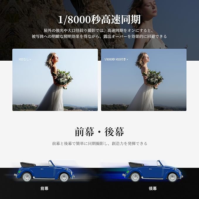 【複数のモードと1/8000s HSS】フラッシュには、i-TTL(自動)、M(手動)、RPT(ストロボ)モードがあります。i-TTLモードは 3(19レベル)の露出補正をサポートし、Mモードは1/256~1/1(81レベル)の出力調整とS1/S2光スレーブ機能をサポートし、RPTモードでは199Hzで最大100回のカスタムストロボフラッシュが可能です。1/8000s HSS(高速同期)と先幕/後幕同期も利用可能です。