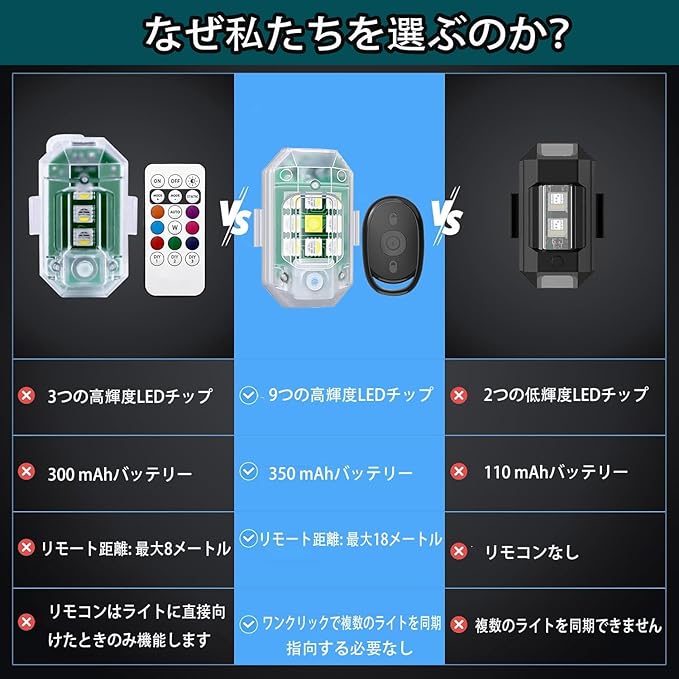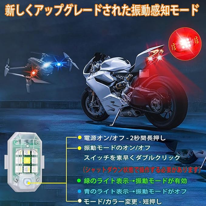 【アップグレードされたリモコン】リモコン付きのLED衝突防止灯は、2.4Gワイヤレスリモコンが付属しており、リモコン遠隔操作約18メートル、車を止めたり、ドローンを着陸させたりする必要はなく、ライトの色やモードを切り替えることができます。長押しでライトのオン/オフ、短押しで色やモードを変更できます。非常に便利で簡単です
