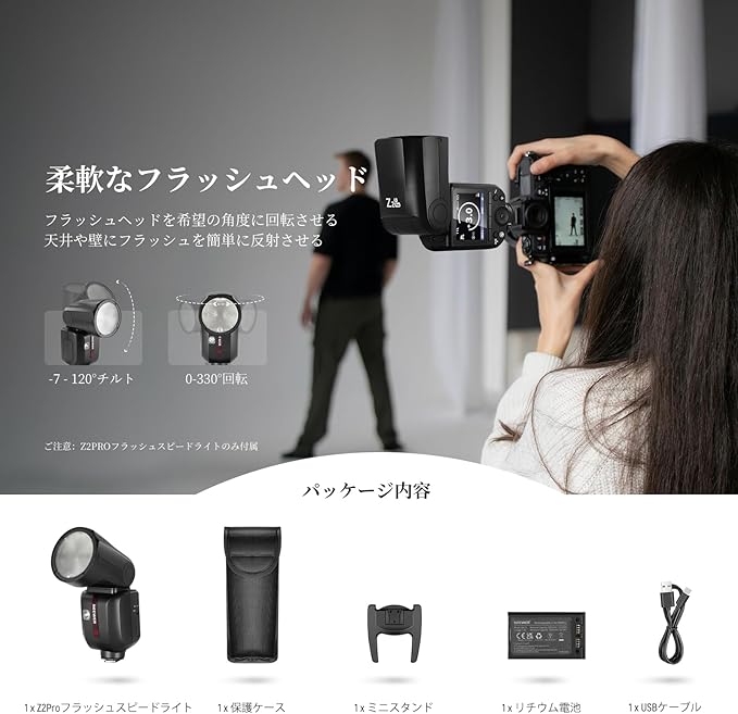 【優れた照明を強化】Z2PRO-Sは76W高出力で、効率的な冷却システムにより、過熱することなく最大100回の連続フルパワーフラッシュを可能です。先進的な石英チューブは、最大100,000回のフラッシュをサポートします。フラッシュヘッドは色温度を高め、リアルな色再現を保証し、330 回転し、-7~120 傾斜し、柔軟なバウンスを実現します。2つの2W 3300K LEDモデリングランプは、10段階の明るさ(01~10)を提供します。