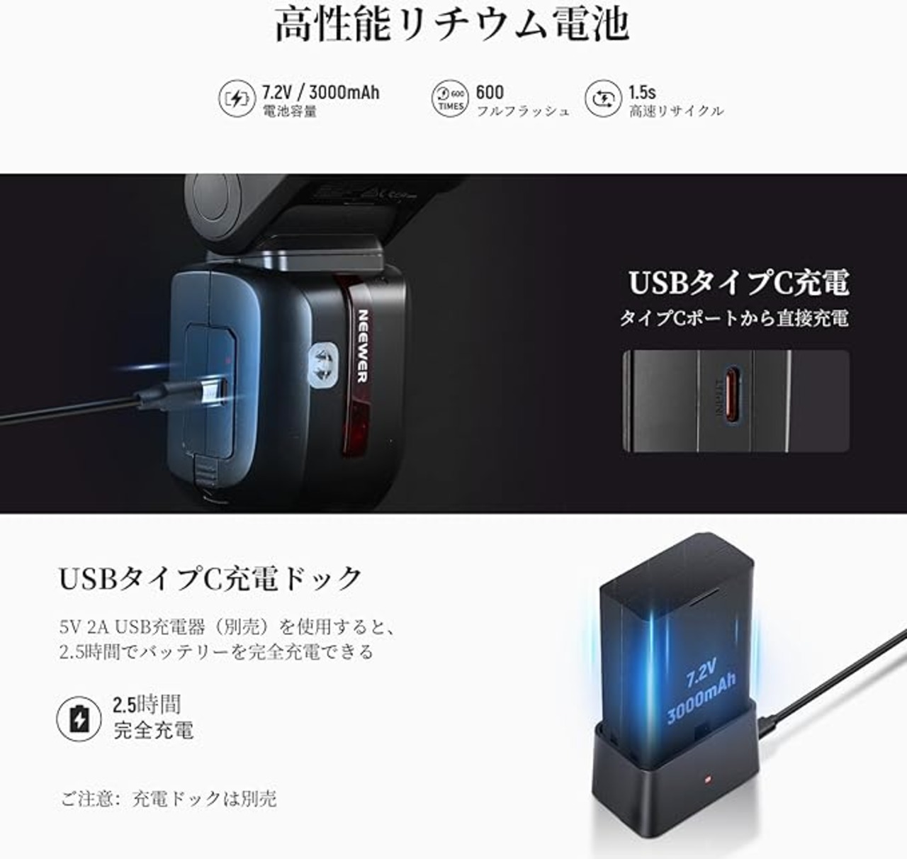 【大容量&高速リサイクル】7.2V/3000mAhリチウムバッテリーにより、600回のフルパワーフラッシュ、1.5秒の高速リサイクルタイム、1/180~1/20000秒のフラッシュ持続時間を実現します。バッテリーには外部充電用Type Cポートが装備されており、5V 2A USB充電器(別売)を使用して2.5時間で充電できます。