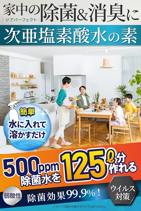 【コスパ良く次亜塩素酸水を生成】高濃度500ppmの次亜塩素酸水をたっぷり約125リットルも生成できる粉末タイプの次亜塩素酸水の素です。(濃度50ppmなら約1250リットル生成可能)