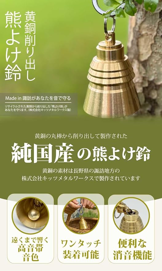 高品質素材: 黄銅の丸棒から削り出して製作された純国産の熊よけ鈴